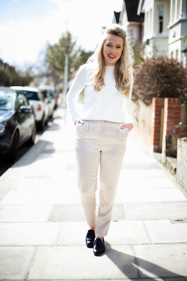 When I first got my satin trousers from Topshop the whole white on white thang was just getting hot again, and I couldn’t wait to try out the look with my new trousers & reptile leather sweater. I loved the combination and felt pretty suave sporting le double blanche. The black patent pumps finished the look off with a punchy contrast.