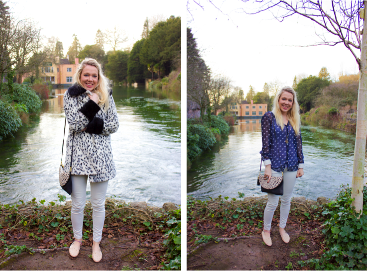 . Miss Selfridge Dalmatian Print Bag . Zara White Skinny Jeans . Topshop Contrast Dalmation Swing Coat . Urban Outfitters M Necklace . Gina Tricot Ring . Michael Kors Watch . Topshop VECTRA3 Studded Slippers . Zara Horse Print Shirt . Links of London Charm Bracelet .