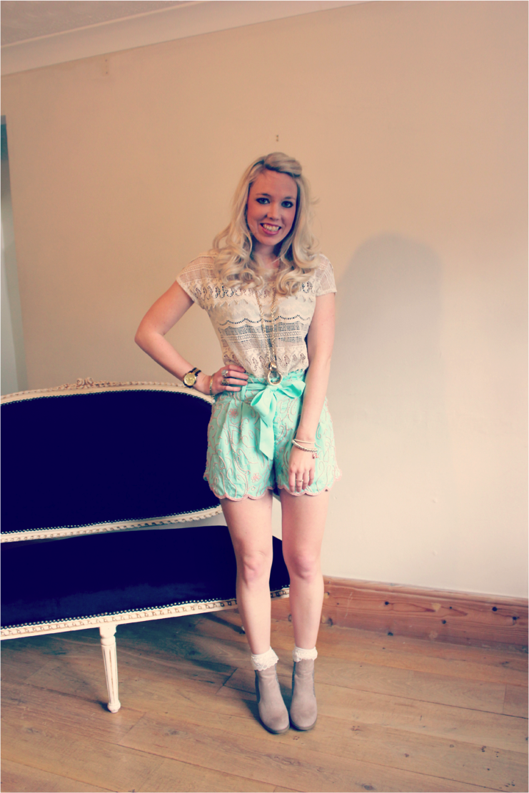 The Virgos Lounge shorts were a gift from the amazing brand themselves and came along with my Carey top which I featured (here). How fab is the collection, the sequin detail just makes me fall in love every time I see them. I teamed them with my Zara lace blouse and my new booties to create this girly spring look. The pastel colour of the shorts is just so pretty – a total fondant fancy, and I love them with these sparkly boots and frilly socks :)