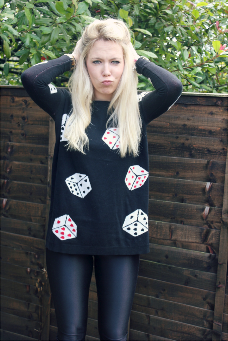 So for my first style challenge we’re working to a ‘theme’ with one of my all time favourite brands, Sugarhill Boutique. Our theme for this style challenge is poker night and as such we’re all getting to style the Sugarhill Boutique ‘lady luck’ collection. As a big lover of Sugarhill Boutique I’d already had a chance to admire this collection at their press day a little while ago. I love the team at Sugarhill & every collection they bring out is unique, original and completely awesome (always great quality too).. Sugarhill Boutique lady luck Jumper £55 . AA Disco Pants . Missguided Deina Boots .