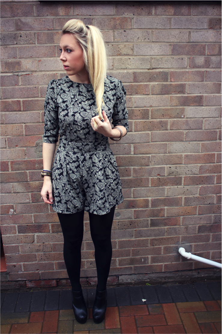 I love this outfit a very large amount. As I huge fan of paisley I guess that’s not surprising though. Playsuits with longer sleeves always look so cute.