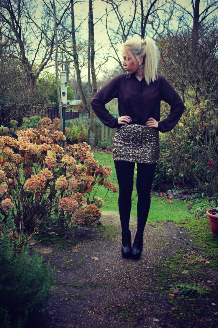 It’s a bit late in posting, but given that the weather is on a downward spiral here in the UK I thought it ‘s probably a good time to share it. It’s really frustrating when it’s super cold but you still want to wear something pretty and dressy, but this outfit was a good compromise. Thick tights teamed with my favourite sequin skirt, and a chic chiffon blouse. Obviously worn with a big fat furry coat on top to keep me warm.