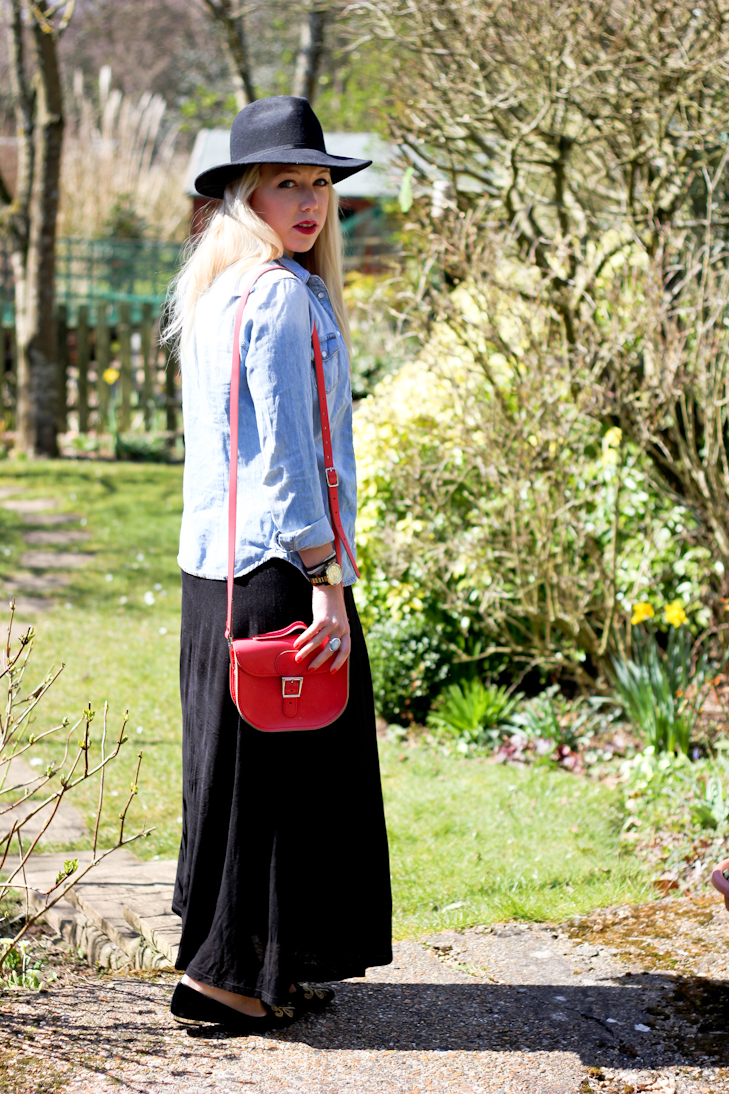 . H&M Maxi Dress . Brit-Stitch Satchel . Taara Necklace c/o . Topshop Fedora £25 .