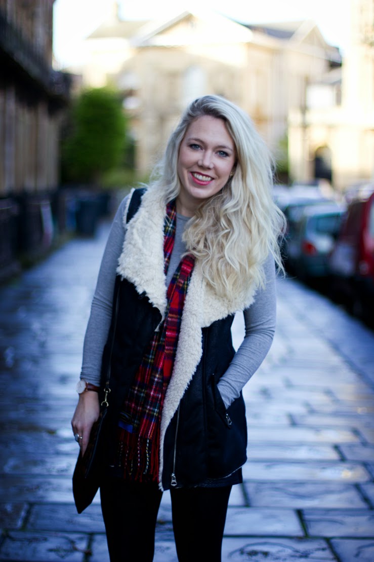 . Office Ankle Boots . Tartan Scarf . Topshop Leather & Fur Clutch . Daniel Wellington Watch .