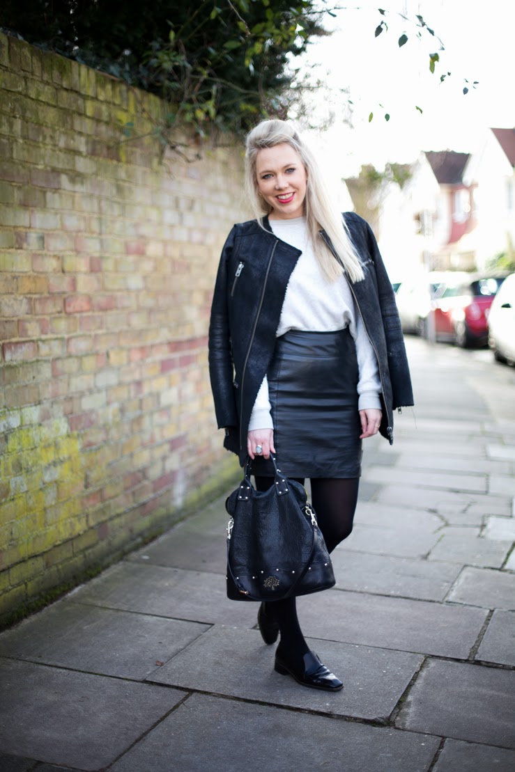 . French Connection Sweater . H&M Leather Skirt . Zara Patent Moccasin . Mulberry Holly . Warehouse Suede Biker .