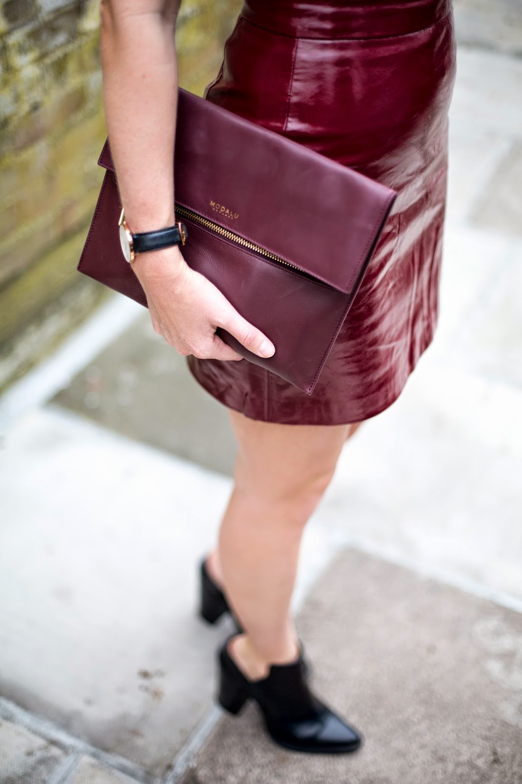 . ZARA PATENT SKIRT . ZARA OPEN BACK BLOCK HEELS . MISSGUIDED FITTED TOP . MODALU CLUTCH .