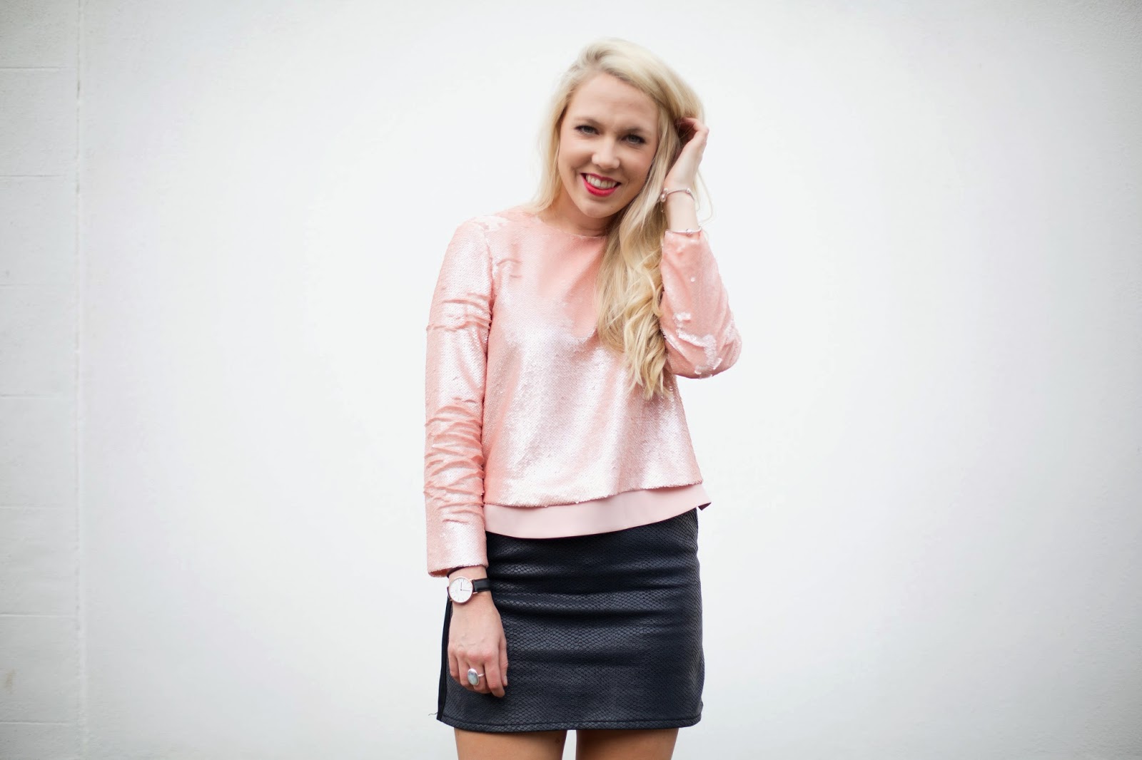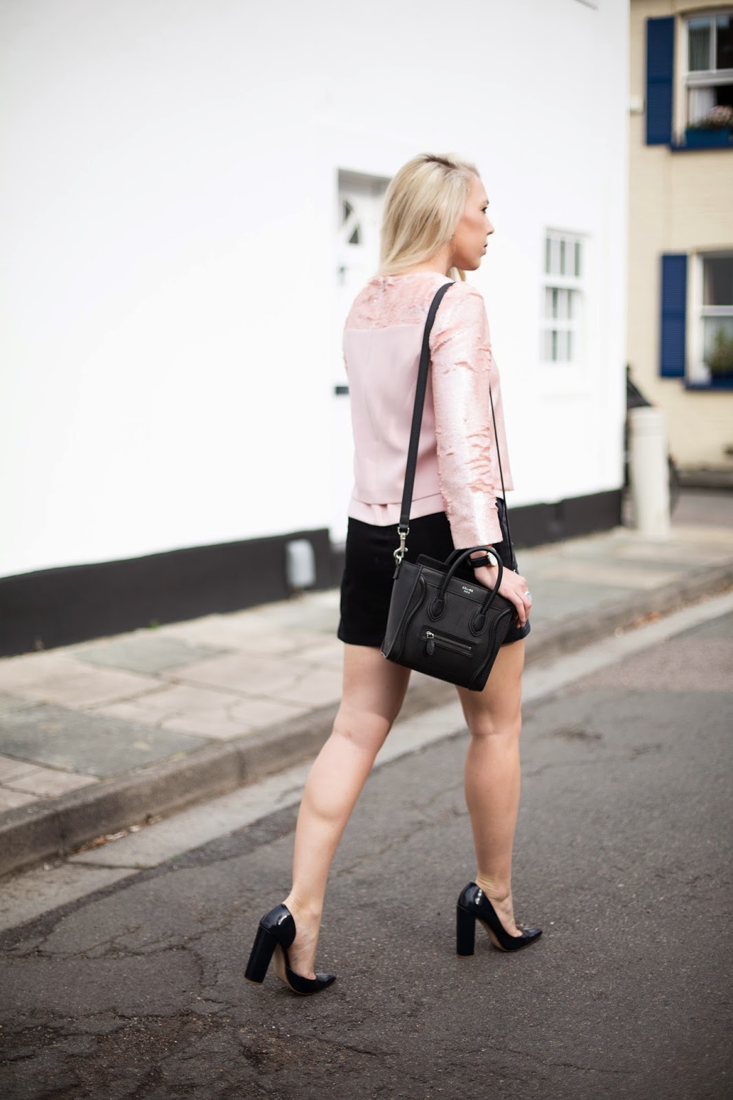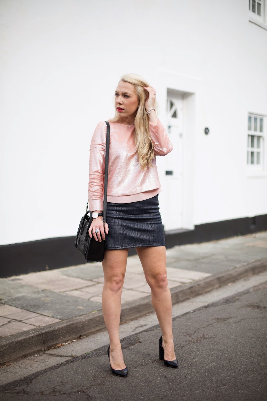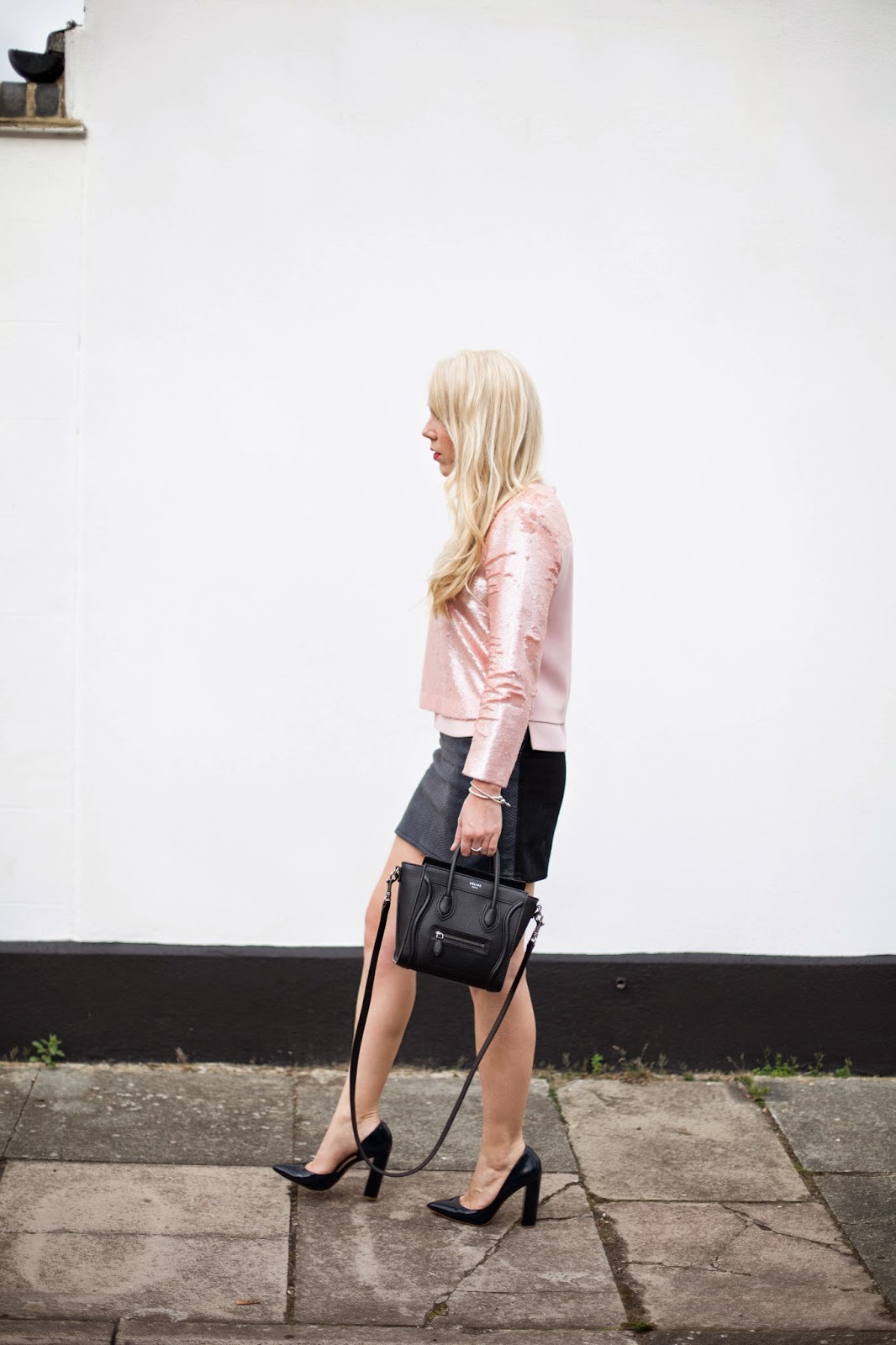 . WHISTLES SEQUIN TOP . TOPSHOP LEATHER SKIRT (OLD) . ZARA PATENT PUMPS . CELINE NANO .