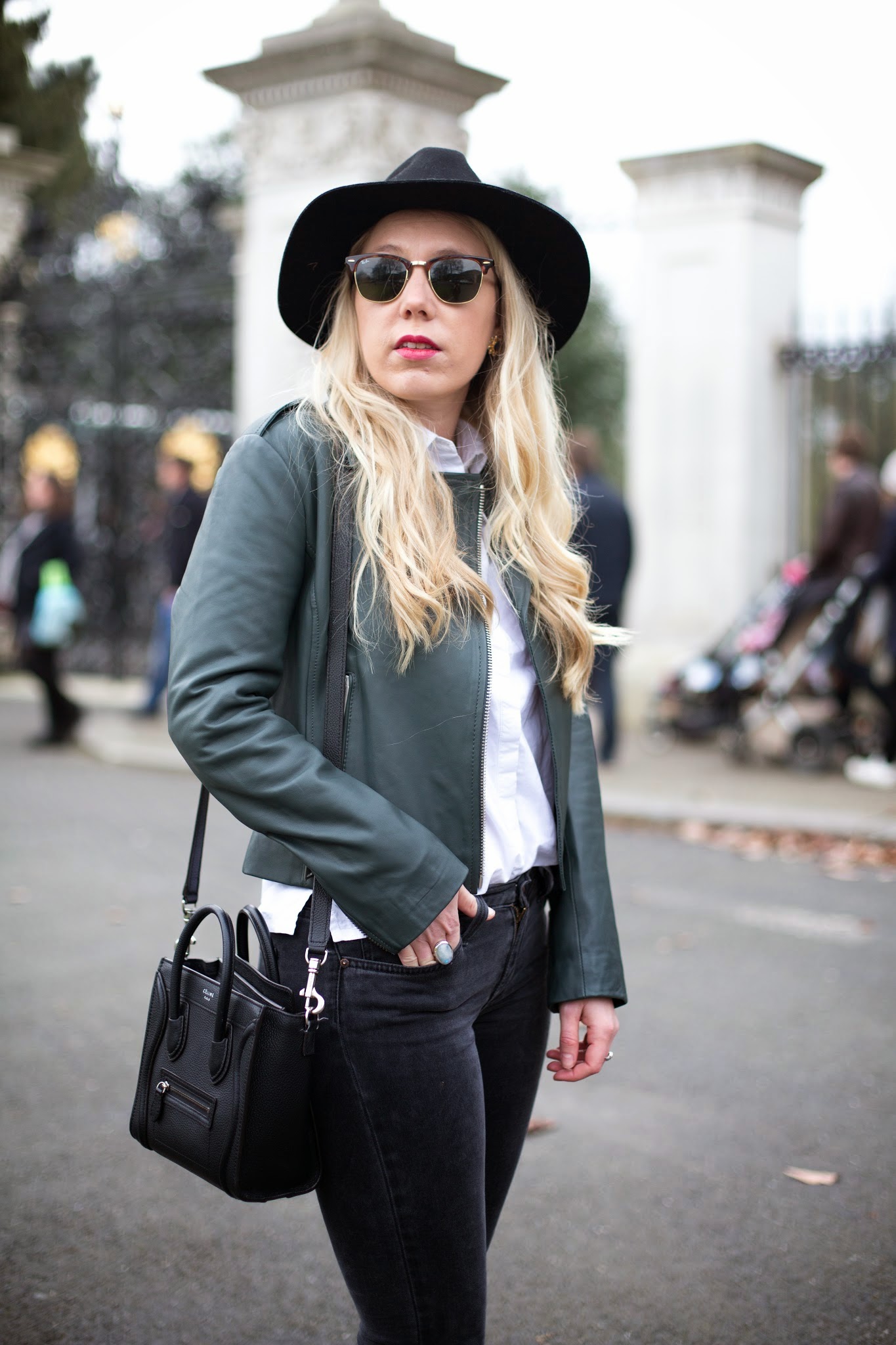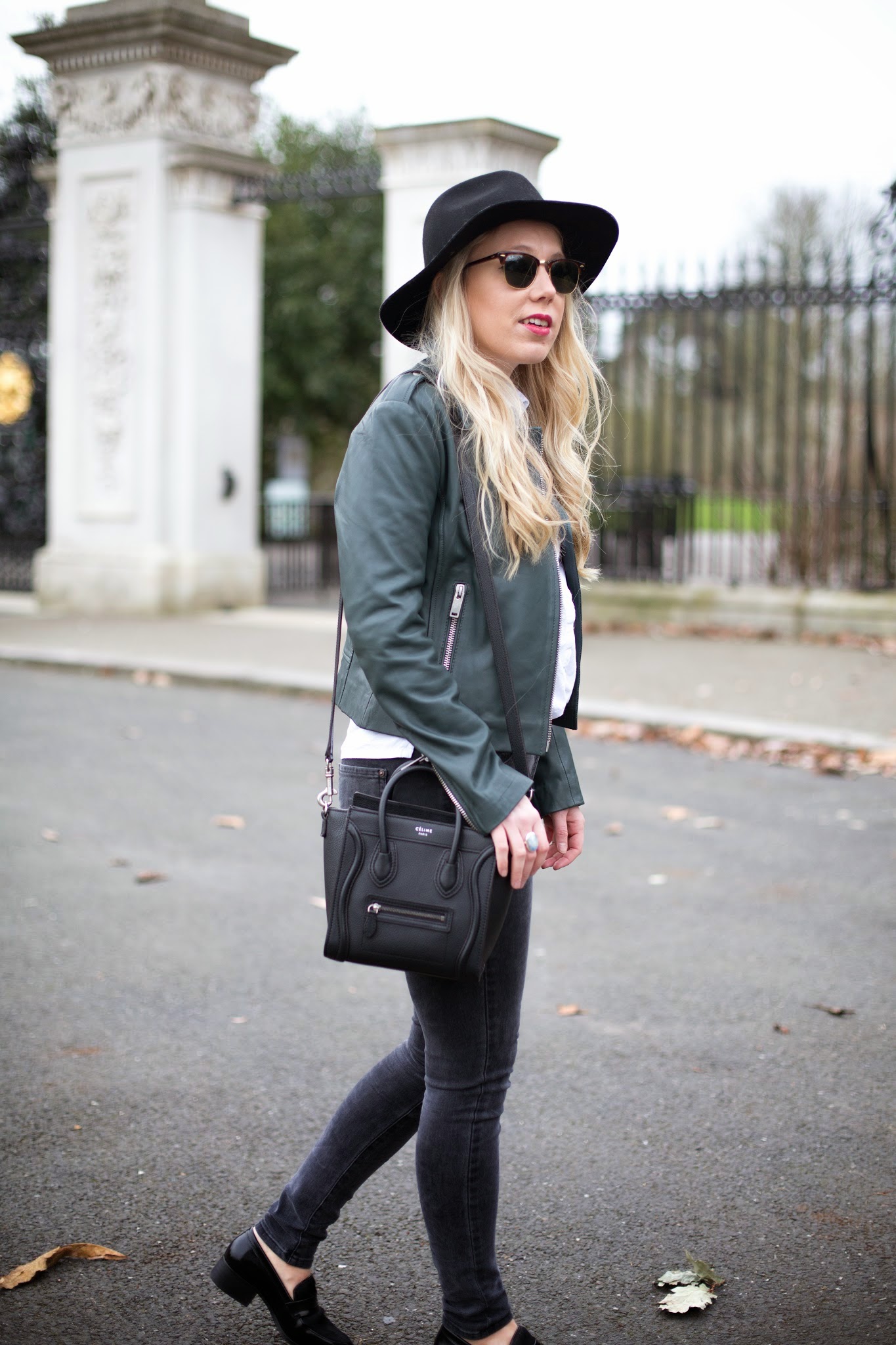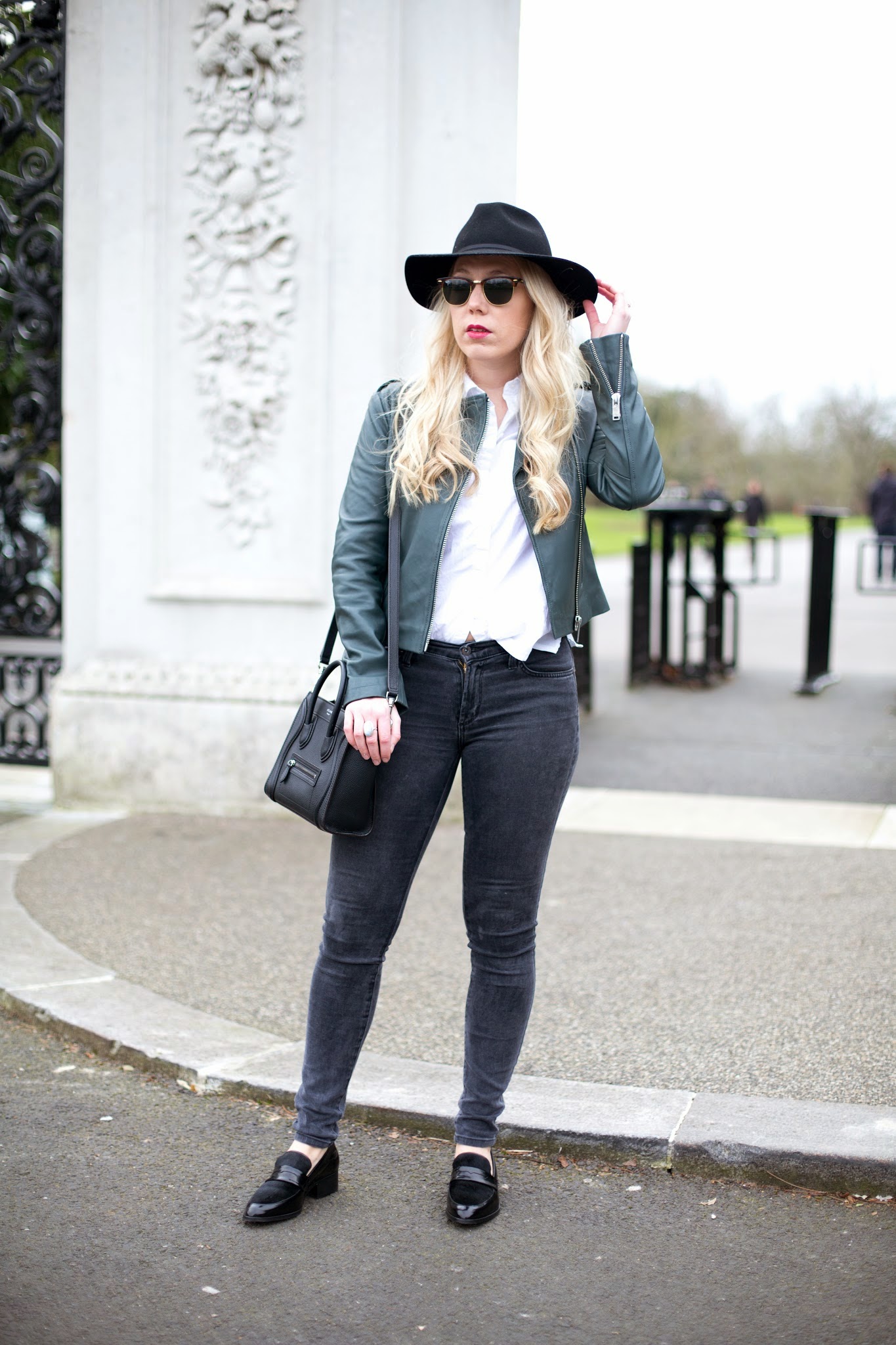 . REISS LEATHER SHEENA JACKET . WHISTLES PATENT & PONY LOAFERS . JAMES JEANS SKINNY JEANS IN SLATE . TOPSHOP WHITE SHIRT . CELINE NANO .