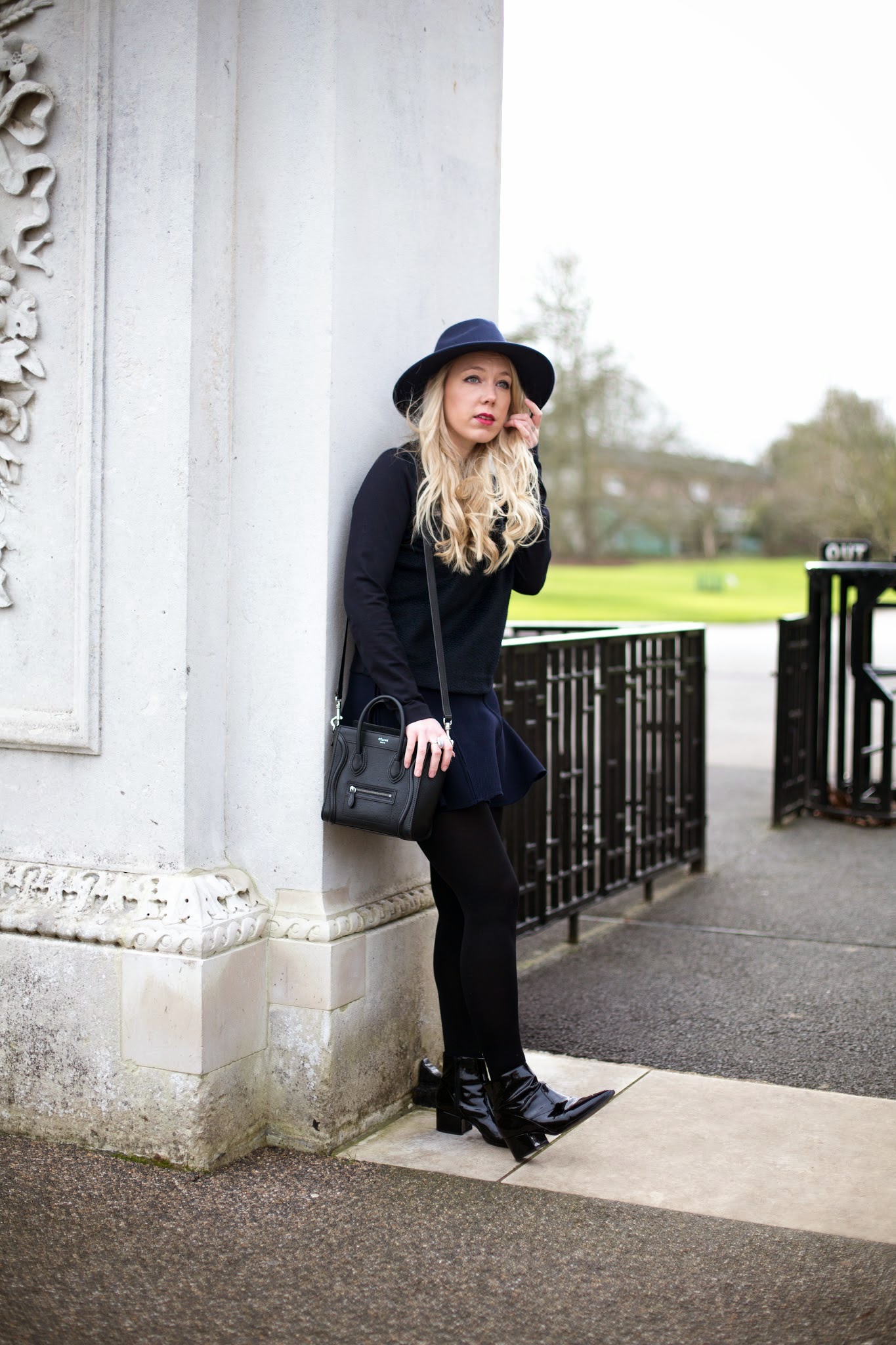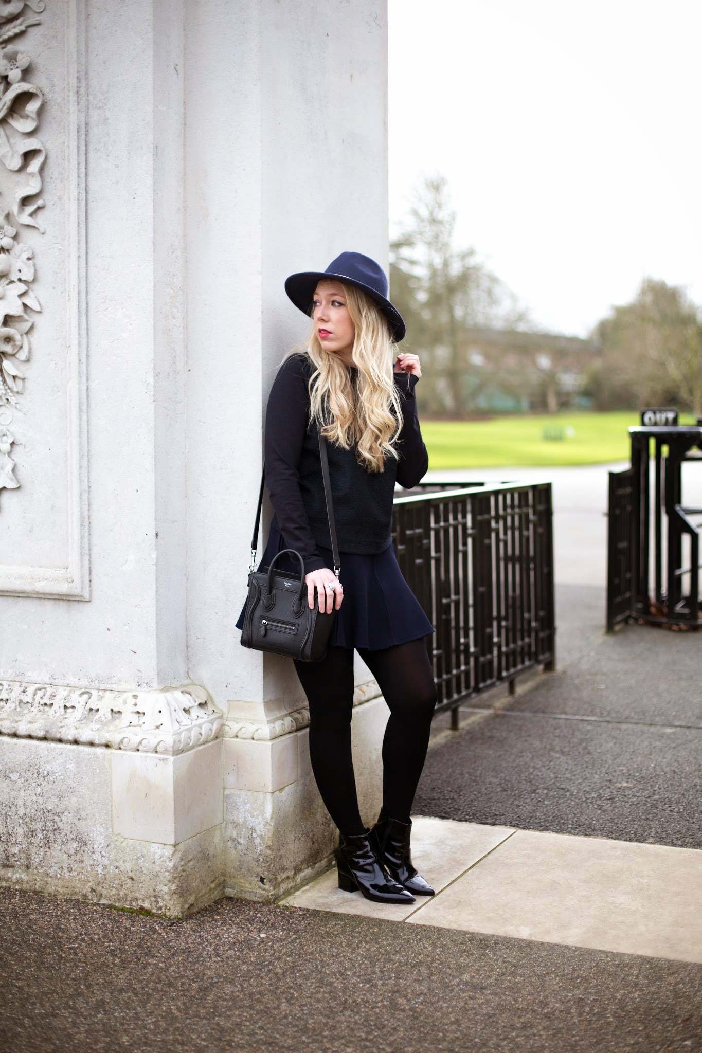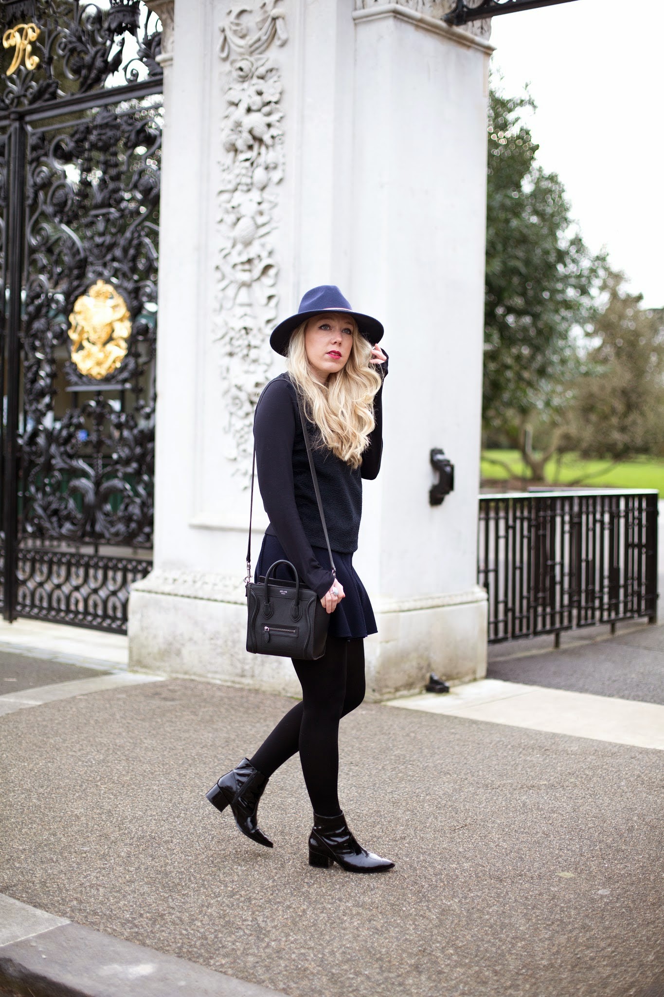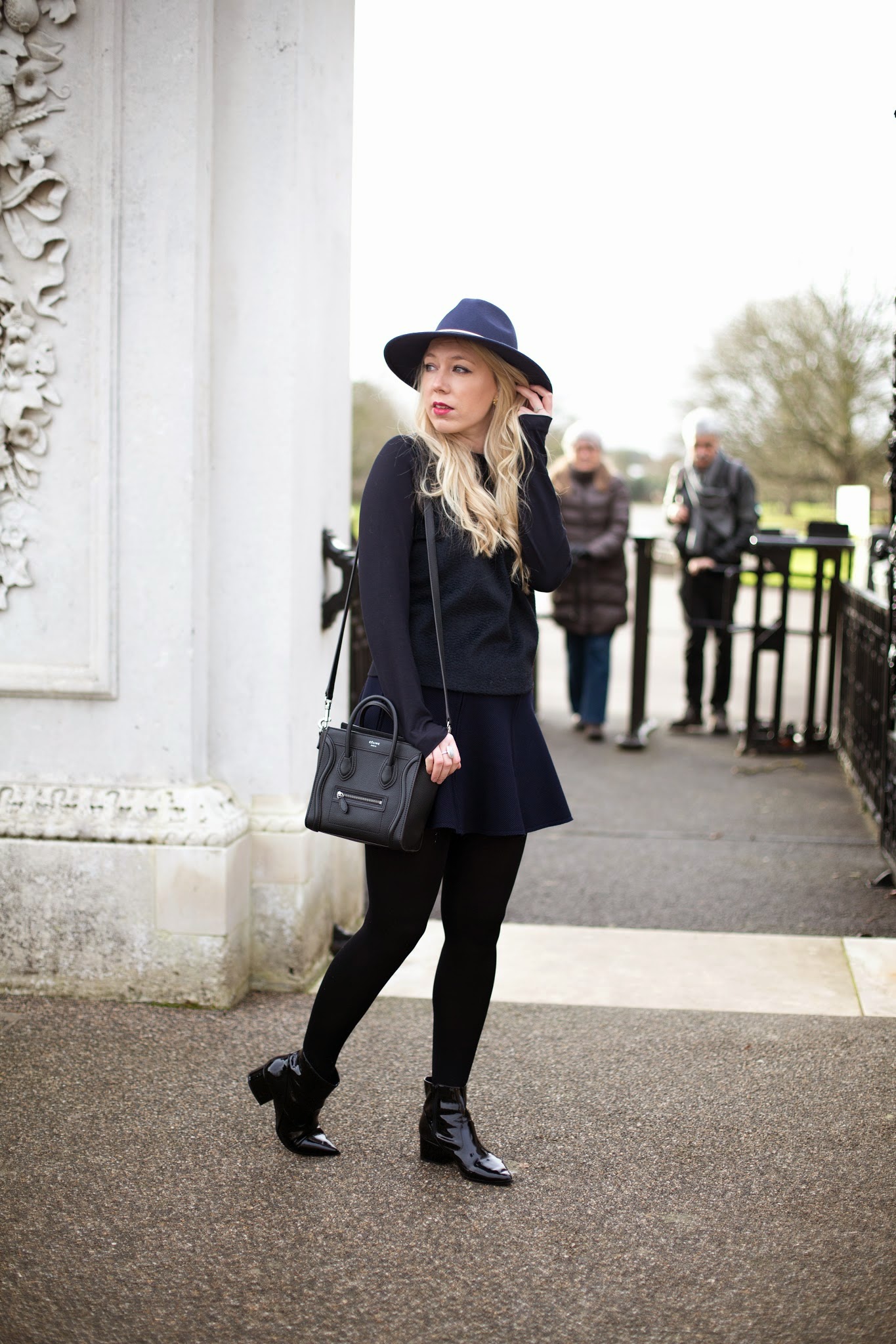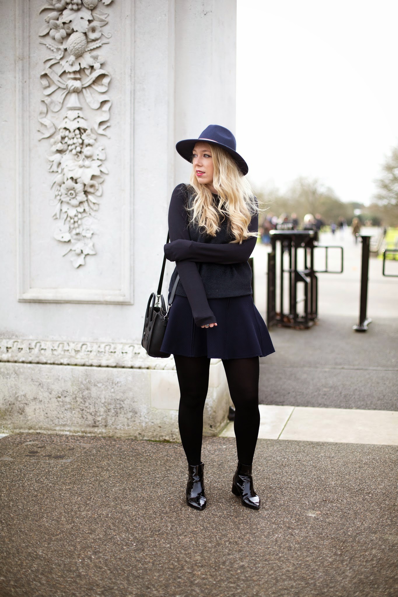 . ZARA NAVY SKIRT . COS NAVY SWEATER . REISS ZELDA FEDORA . CELINE NANO . ALDO ALEWEIL BOOTS .